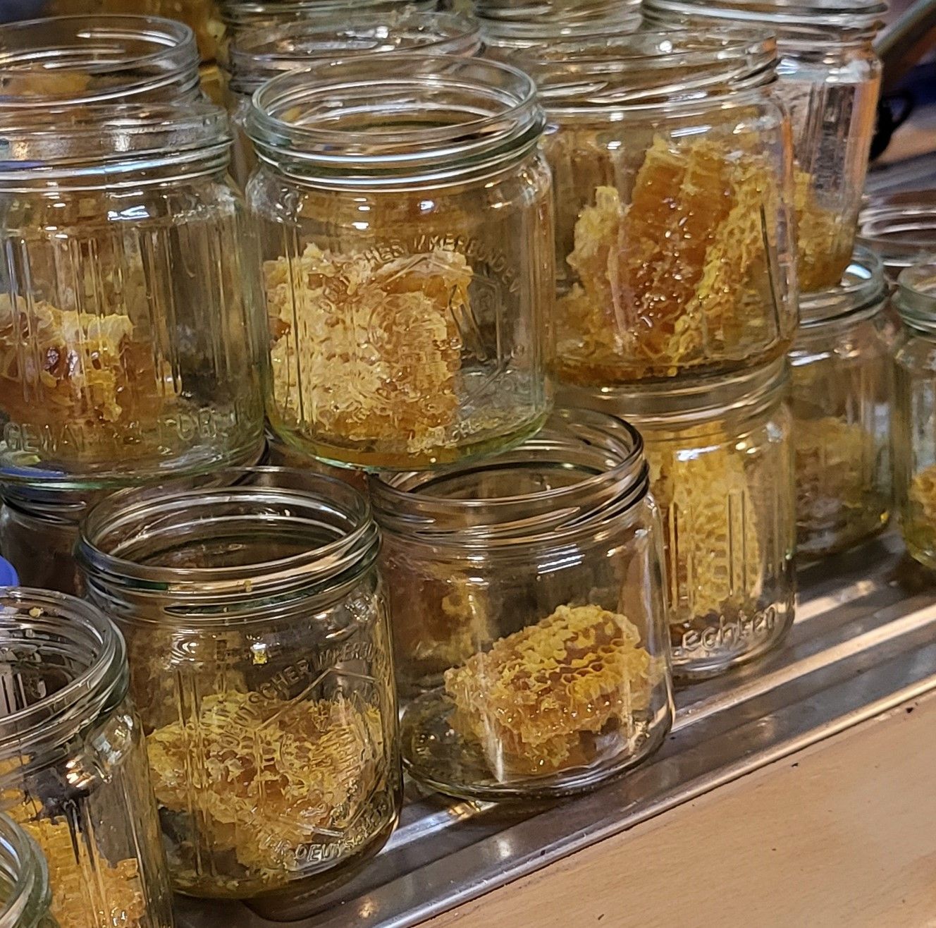 Scheibenhonig – Wabenhonig ...wird nach der Entnahme aus dem Bienenvolk aus dem Rähmchen geschnitten und verpackt. Um ein Kandieren des Honigs in der Wabe bei längerer Lagerung zu verhindern, kann er eingefroren werden. Wabenhonig ist frühzeitig vor dem Schleudern zu bestellen.