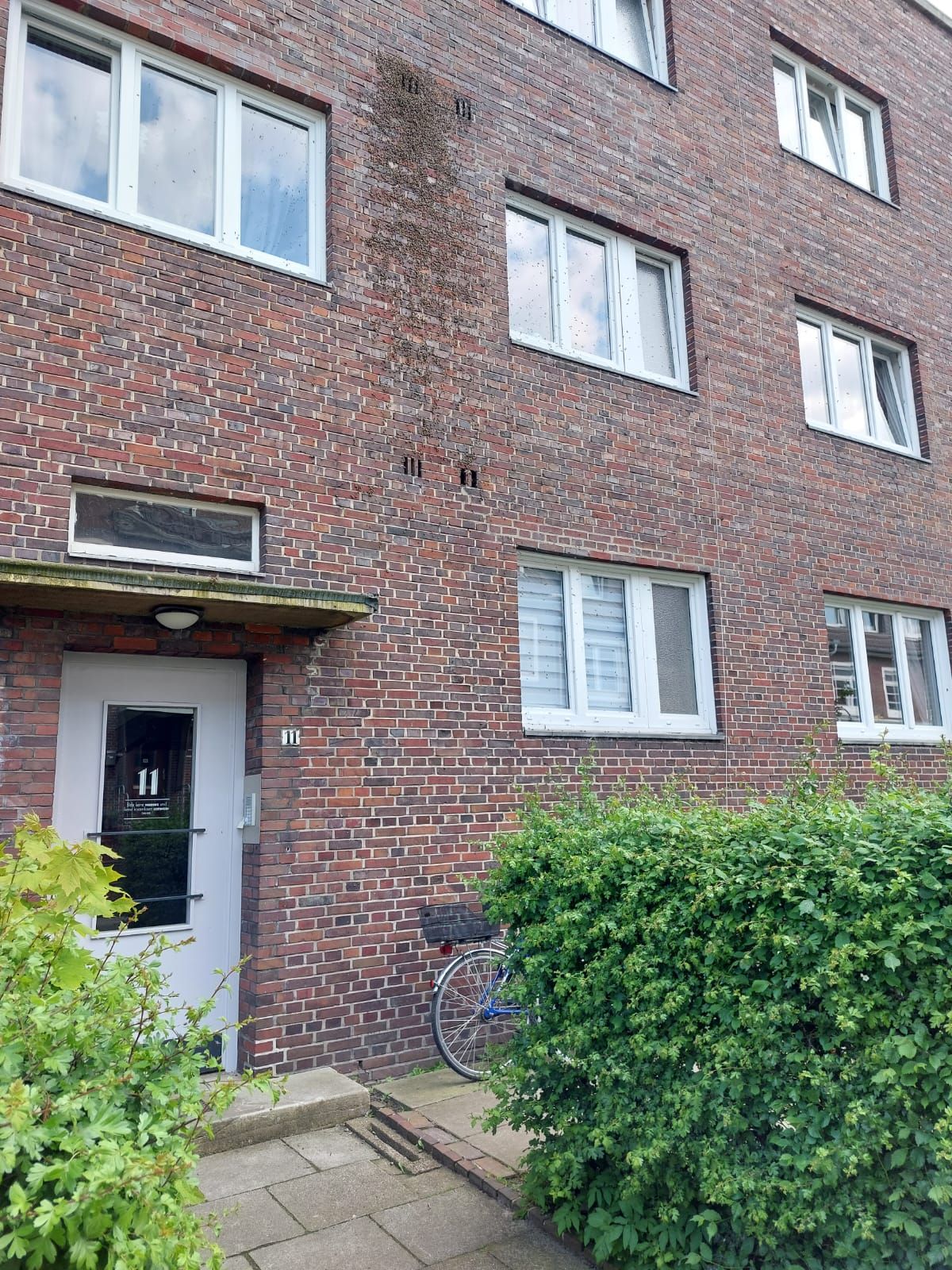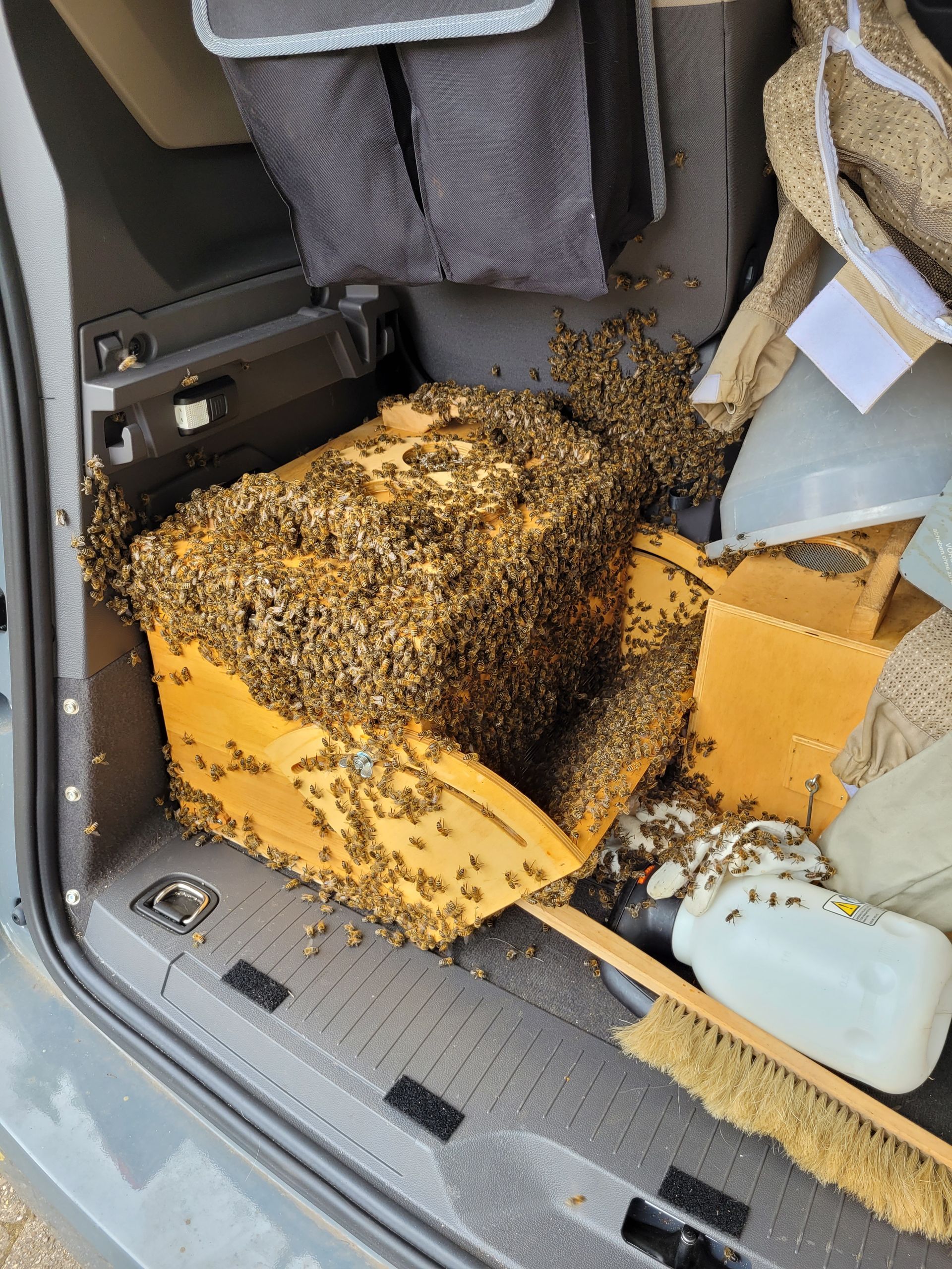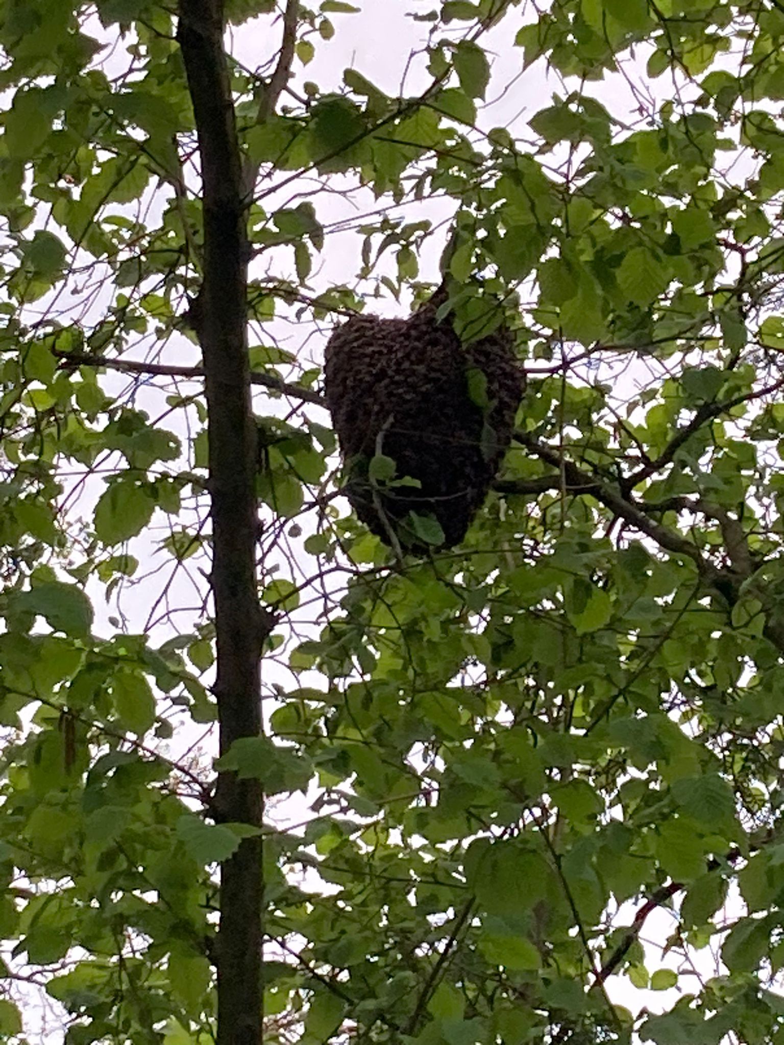 Je dicker die Bienen-Traube am Ast wird, desto ruhiger wird es im Garten. Irgendwann hängen alle Schwarmbienen im Weißdorn. Sie schützen ihre Königin, die inmitten der Traube sitzt. Es ist fast still. Jetzt muss gehandelt werden, denn die Bienen haben nun einen Sammelplatz gefunden. Von hier aus fliegen die Spurbienen aus, um eine geeignete Nisthöhle zu finden. Das Problem ist nur, dass es heutzutage wenig Nistmöglichkeiten wie Baumhöhlen gibt. Außerdem macht auch die Varroamilbe den Bienen in der freien Natur das Überleben schwer. Keiner weiß, wie lange der Schwarm nun im Weißdorn bleiben wird. Innerhalb von drei Tagen müssen sie eine neue Unterkunft gefunden haben. Danach ist ihr Honigvorrat aufgezehrt und ihre Honigblase leer.