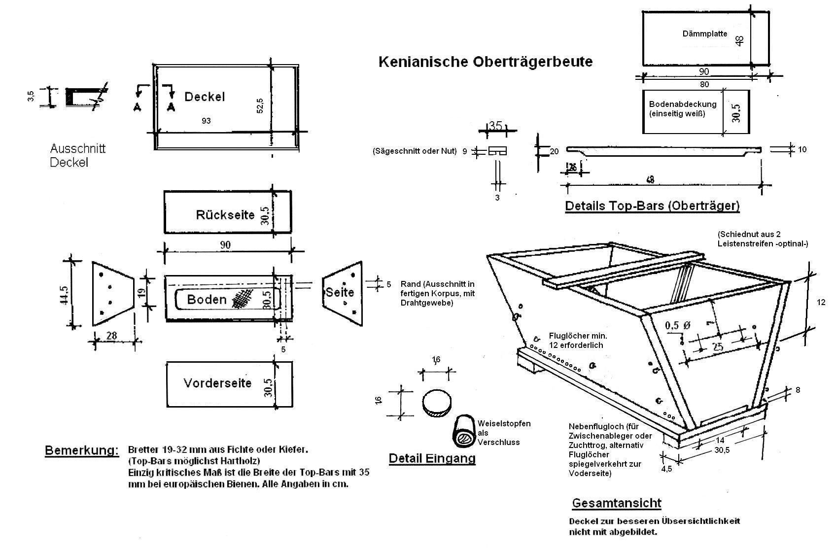 Der Top bar hive soll nicht die modernen Magazinbeuten der klassischen Imkerei ersetzen, sondern eine neue Zielgruppe zur Haltung von Bienen motivieren und dabei einen wichtigen Beitrag zu einer breitangelegten Bestäubung leisten.Für den Bau dieser Bienenbeute gibt es verschiedene Varianten, bedeutsam sind vor allem die schrägen Seitenteile, die Breite der Oberträger und das Gesamtvolumen der Behausung.