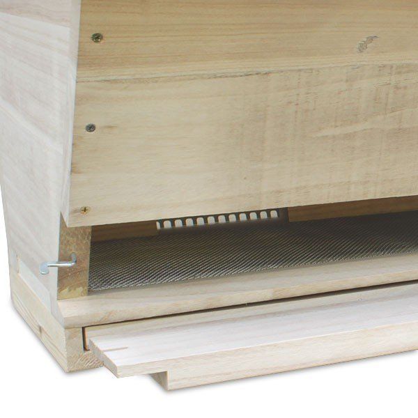 Der Varroaboden besteht aus einem Gitterboden unter den Waben und einem darunter befindlichen, herausnehmbaren Schieber zur Kontrolle der Menge der durch das Gitter fallenden Varroa.