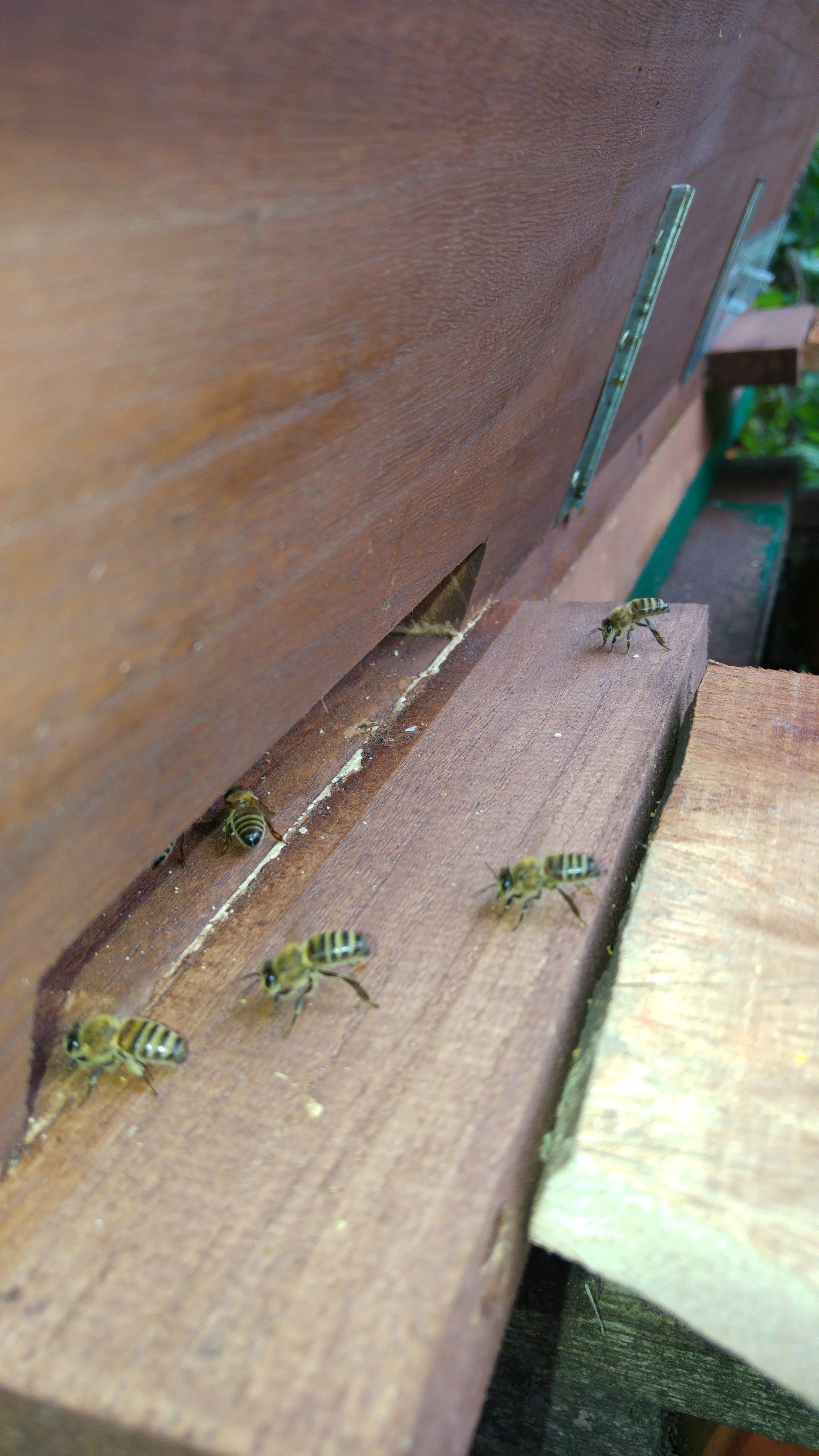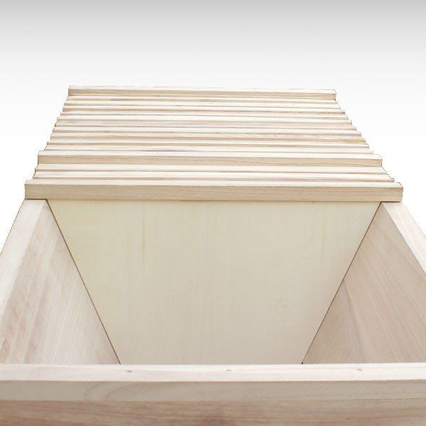 Bu fotoğraf, TBH'nin arkasındaki dışarı çekilmiş Varroa sürgüsünü ve onun üzerinde kanatlarla tutulan bir tahtayı göstermektedir. Bu kapak, kovanın içine ve dolayısıyla kovanın tabanına erişebileceğiniz tam genişlikte bir kapağı kapatır. Ambar aracılığıyla kovanın alt kısmı üzerinde kolayca 'çalışabilirsiniz', örneğin kışın ölüleri ortadan kaldırabilirsiniz.